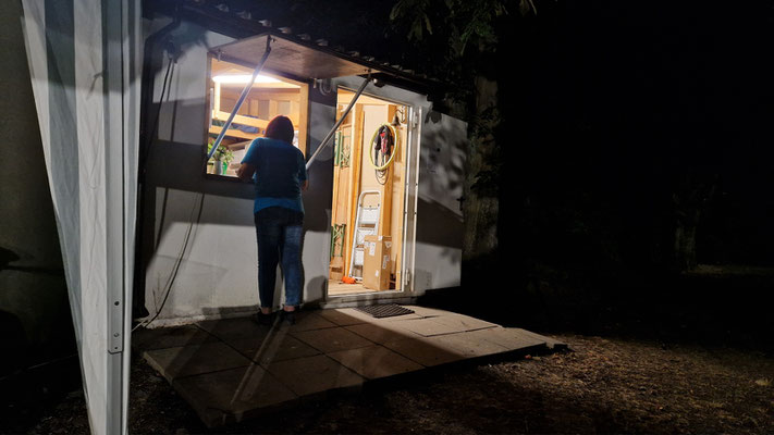 11.07.2015: Die Fensterklappe und die Eingangstür sind montiert, nur noch ein paar verbleibende, kleinere Restarbeiten.
