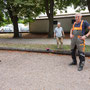 Ein neuer Belag musste her und man konnte noch 12 Tonnen feineres und gröberes Splitmaterial von Hand auf dem Platz ausbringen. Vielfältige Bahnen mit unterschiedlichen Herausforderungen von "Autobahn" bis zu tiefem, groben Gelände können nun bespielt werden, was einigen Teilnehmern doch sichtlich zu schaffen machte.